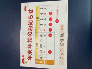 12月31日(水)~1月4日(日)の期間、休診とさせて頂きます。