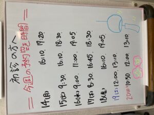 上記お時間以外にもキャンセルや予約時間の変更により予約の空きができるケースもございますのでお気軽にお電話、お問合せお待ちしております。